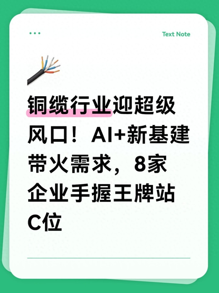 铜缆行业的爆发,本质上是数字经济和能源转型的必然结果。AI算力、新能源汽车、特高压电网这些新基建,就像给铜缆行业踩了“油门”,而8家本土企业凭借技术、产能和客户资源的优势,站在了这场产业浪潮的前沿。